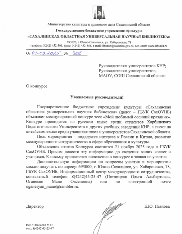 2024-2025年是中俄文化年,2026-2027年是中俄教育年。为深化中俄在文化、教育等领域的合作,积极开展文化交流与文明互鉴,夯实学生语言基础,激发化学习兴趣和热情,依托俄罗斯萨哈林州立通用学术图书馆与哈尔滨师范大学2022年签订的合作协议,2025年9月中旬至2025年11月末,俄罗斯萨哈林州立通用学术图书馆主办和斯拉夫语学院联合举办题目为«Мой любимый осенний праздник»(我喜爱的秋天节日)俄语作文比赛。斯拉夫语学院俄语系对俄合作教研室组织本科生和硕士研究生近百人参加本次比赛,中方和俄方多位教师参与指导。