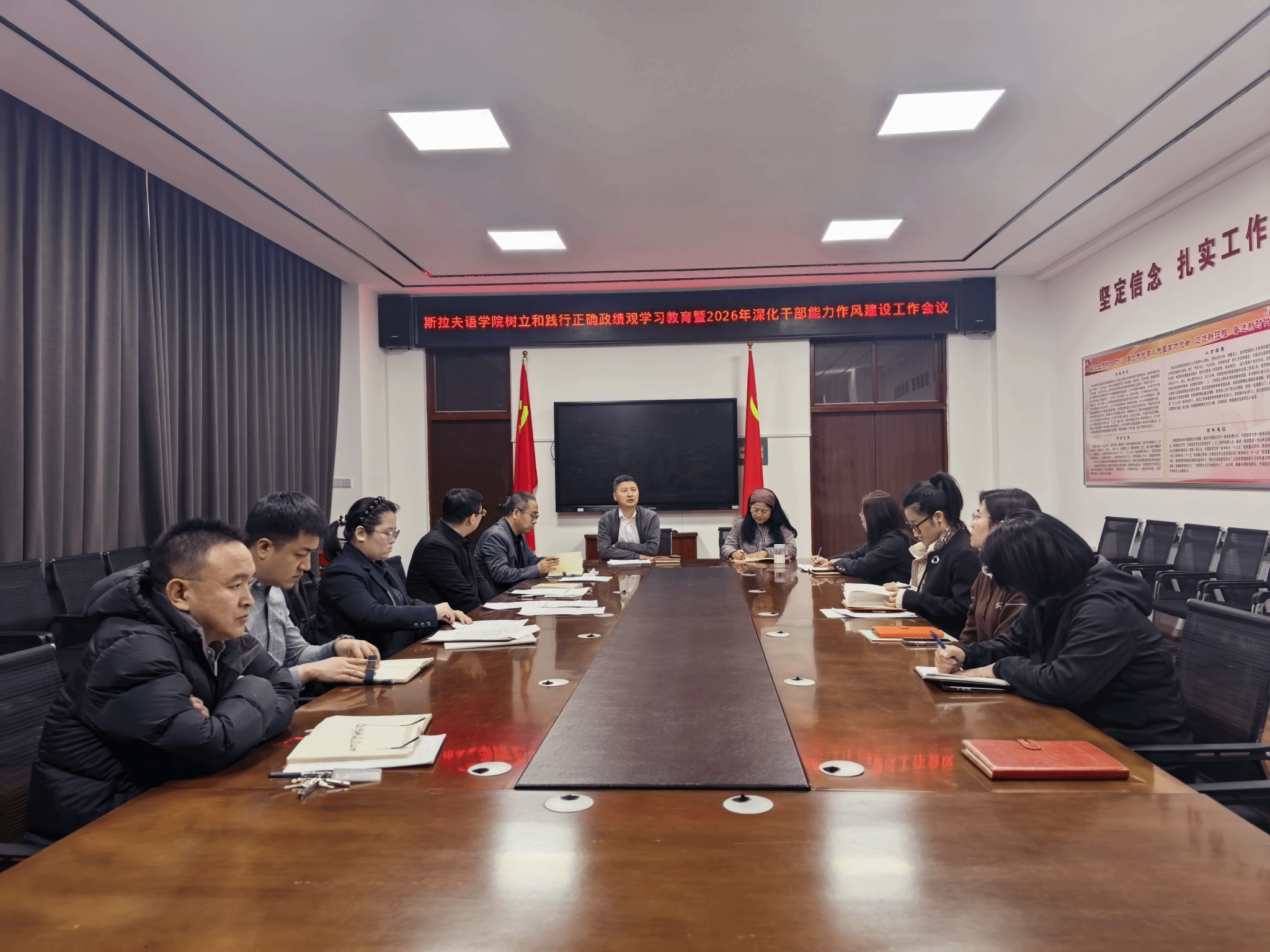 会上集中学习了中央党的建设工作领导小组会议研究部署树立和践行正确政绩观学习教育工作精神、以及省委常委会关于树立和践行正确政绩观学习教育和深化能力作风建设工作的会议精神。解读了《哈尔滨师范大学关于在全校开展树立和践行正确政绩观学习教育的实施方案》《哈尔滨师范大学深化干部能力作风建设2026年实施方案》,并结合“两个方案”对两项工作的做出具体安排部署。